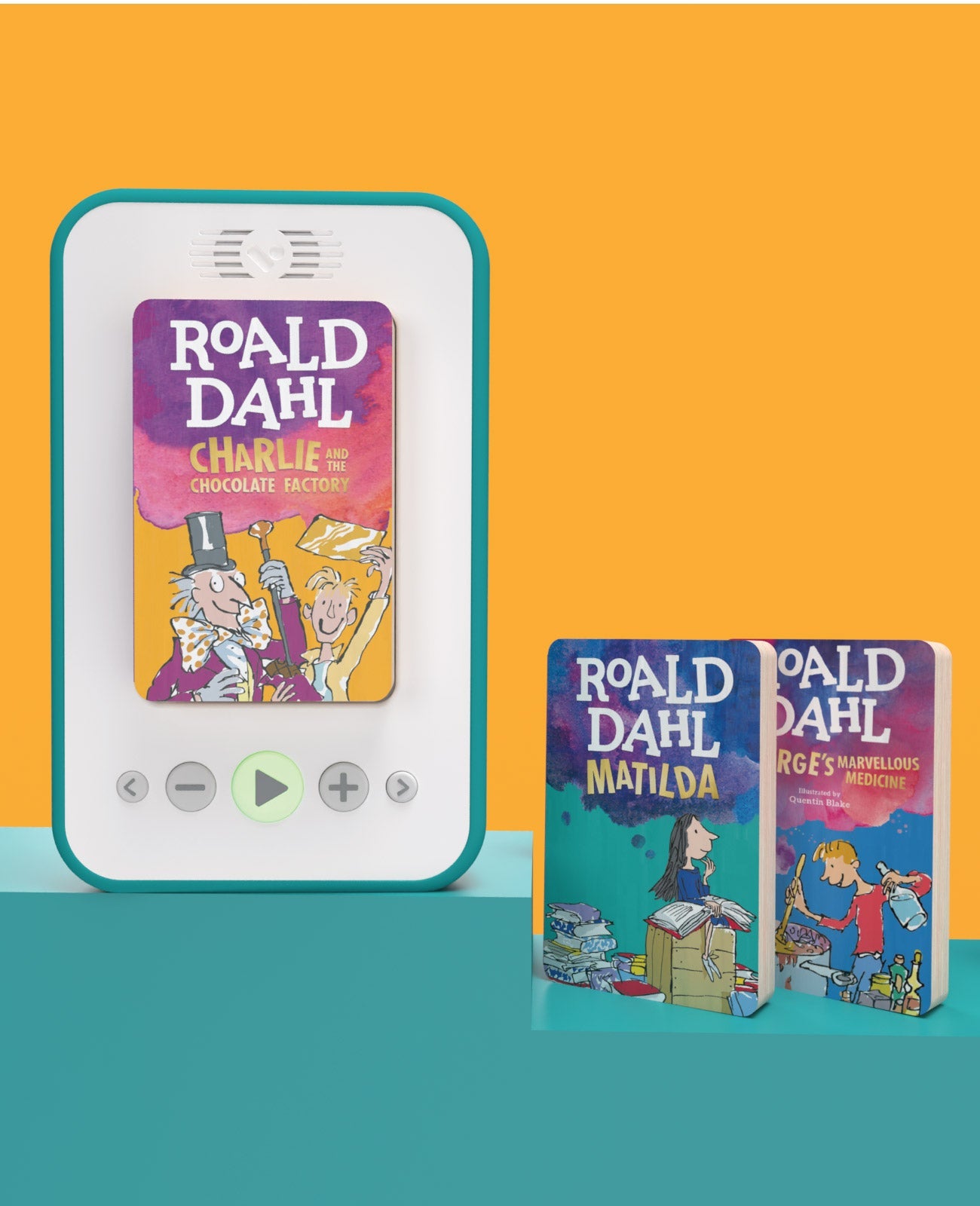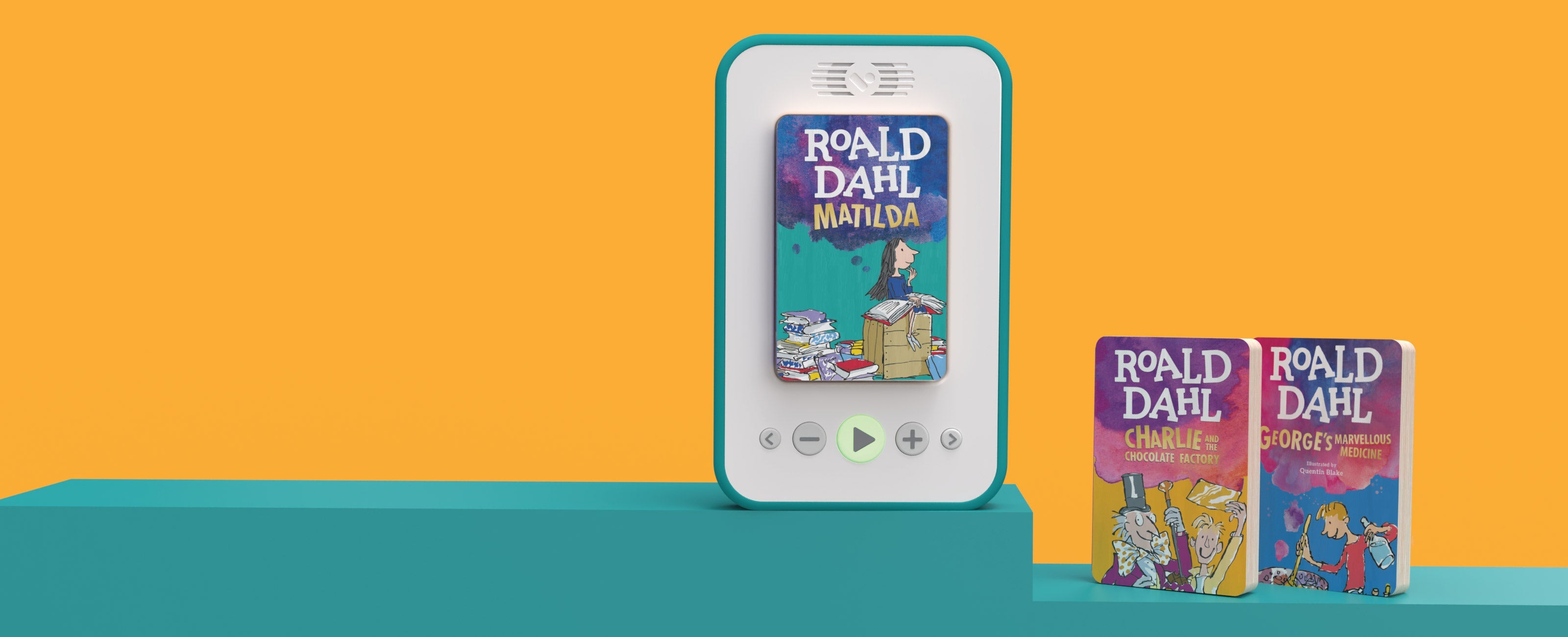Depending on the model you can find the on/off switch in the recess where your block connects to the player. If you have the latest model then you turn the player on/off by holding the main button for 1 to 2 seconds. Then simply pop in your chosen block, and press play. Use the arrow buttons to jump to the next or previous chapters, and the + and - to adjust the volume.
